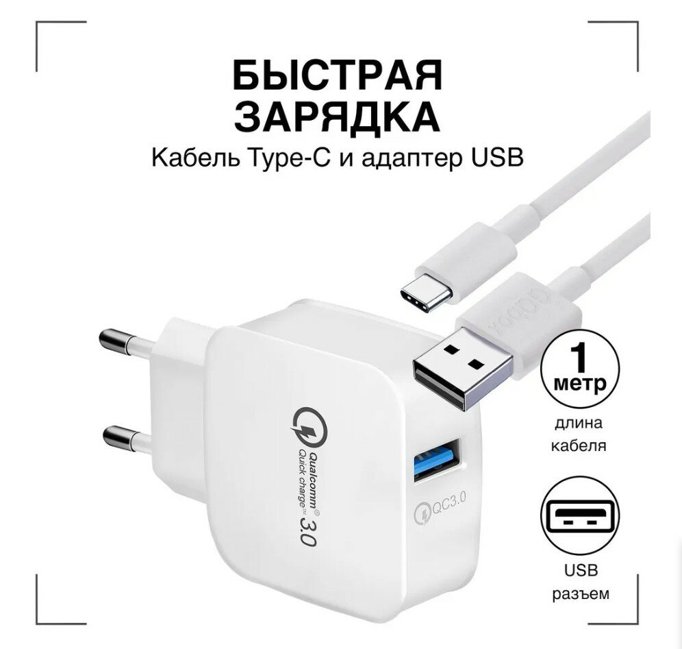 Зарядное устройство для телефона / GQbox / Зарядка type c / Кабель TYPE C Standart + блок питания для телефона. QC3. LZ-008. Standart. Белый / Сетевое зарядное устройство интересное: