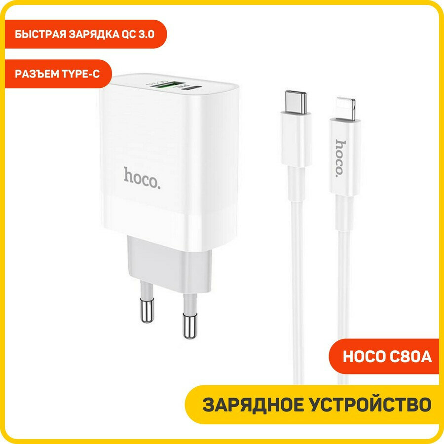 Купить Сетевое зар. устр. Hoco C80A с шнуром Type-C на Lightning 1USB/1С PD3.0/QC3.0 3A 20W белое