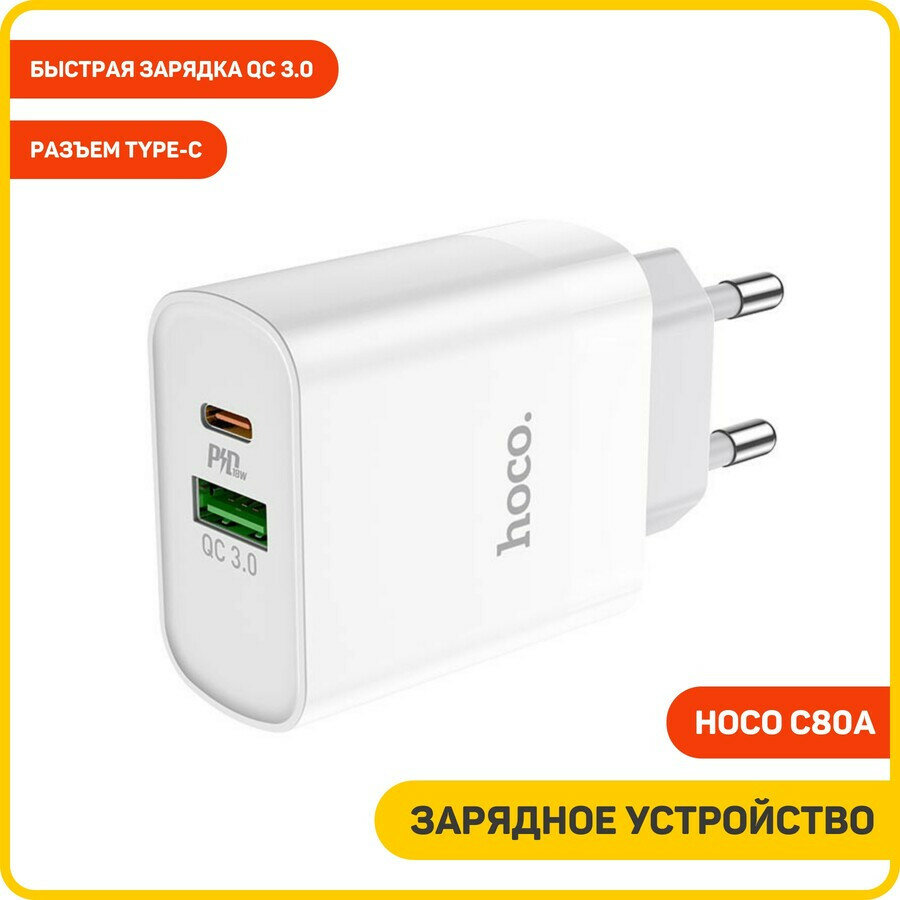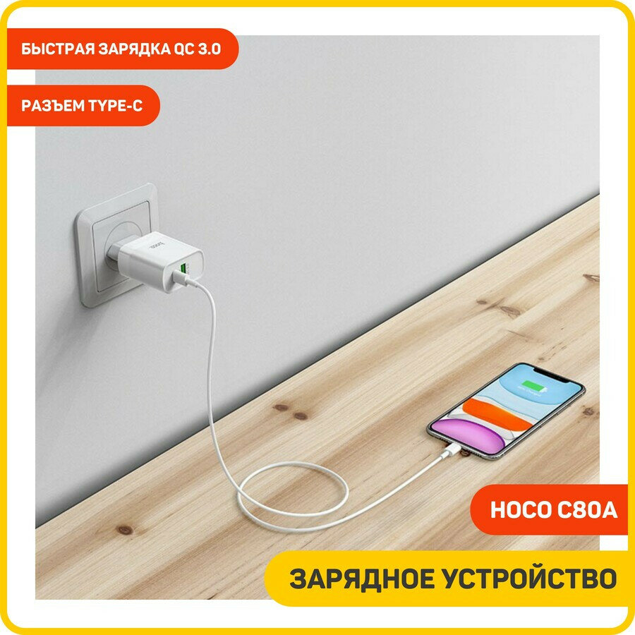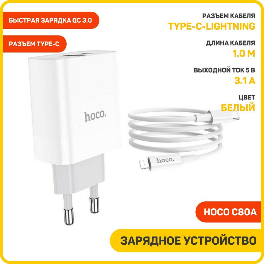 Сетевое зар. устр. Hoco C80A с шнуром Type-C на Lightning 1USB/1С PD3.0/QC3.0 3A 20W белое интересное:
