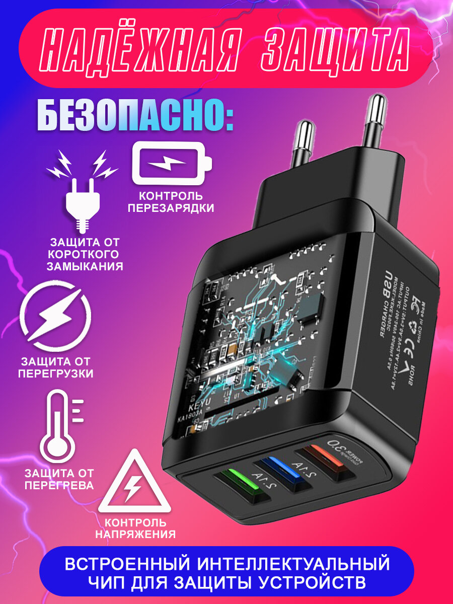 СохранитьЗарядное устройство для телефона 3 USB samsung, honor, xiaomi, realme / зарядка 18W для iphone / блок питания универсальный для смартфона / черный интересное: