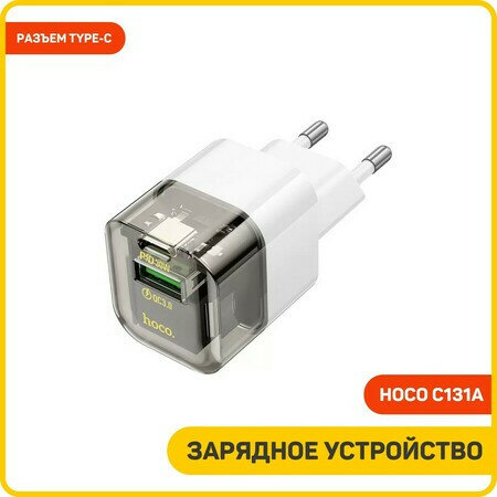 Сетевое зарядное устройство, 1 USB 3.0 QC+1 PD 30W (C131A), HOCO, прозрачный с черным
