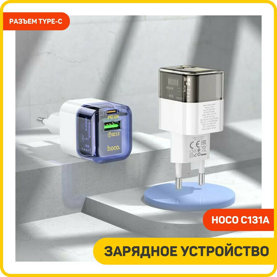 Сетевое зарядное устройство, 1 USB 3.0 QC+1 PD 30W (C131A), HOCO, прозрачный с синим