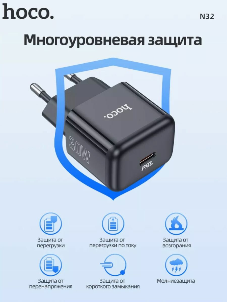 Сетевое зарядное устройство Hoco N32, 1 Type-C, 30 Вт, PD + QC, чёрное Hoco 9881651 .
