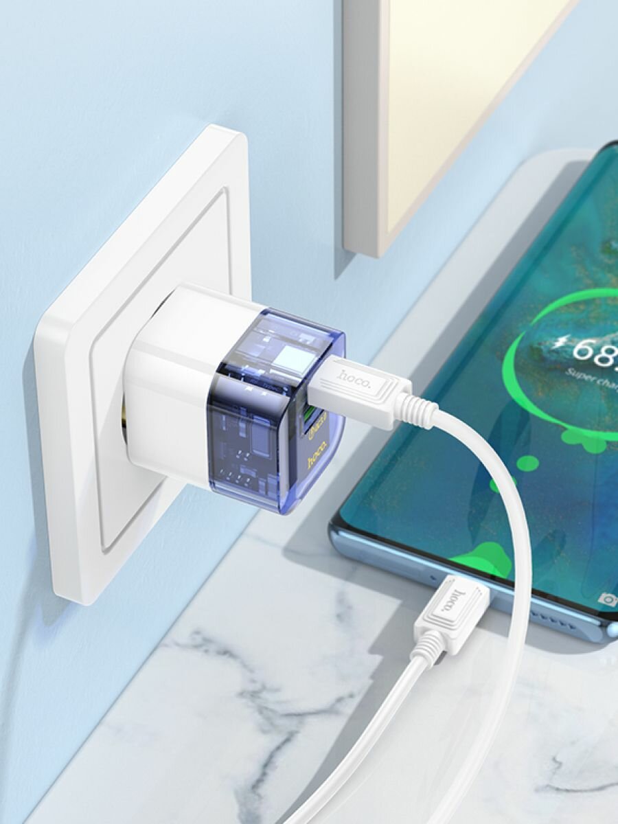 Сетевое зарядное устройство, 1 USB 3.0 QC+1 PD 30W (C131A), HOCO, прозрачный с синим
