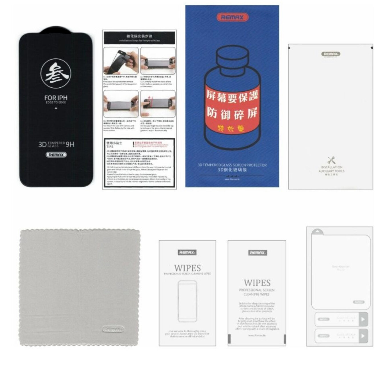 | Подробная комплектация | 1. Защитное стекло для iPhone Remax GL-27 2. Спиртовая салфетка 3. Салфетка из микрофибры 4. Стикеры для удаления пыли 5. Инструкция по наклеиванию 6. Надежная упаковка |