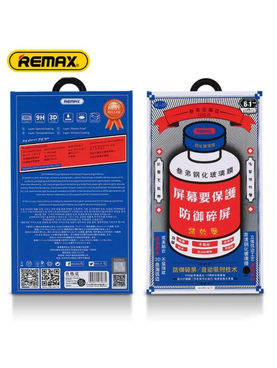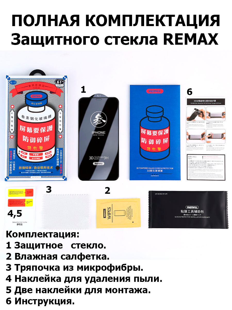 | Подробная комплектация | 1. Защитное стекло для iPhone Remax GL-27 2. Спиртовая салфетка 3. Салфетка из микрофибры 4. Стикеры для удаления пыли 5. Инструкция по наклеиванию 6. Надежная упаковка |