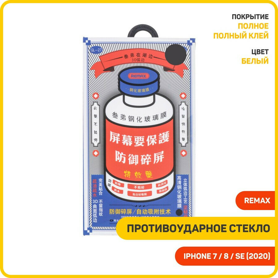 Защитное 3D стекло для iPhone 7, iPhone 8, iPhone SE 2020 Remax Medicine Glass GL-27 Белое интересное:
