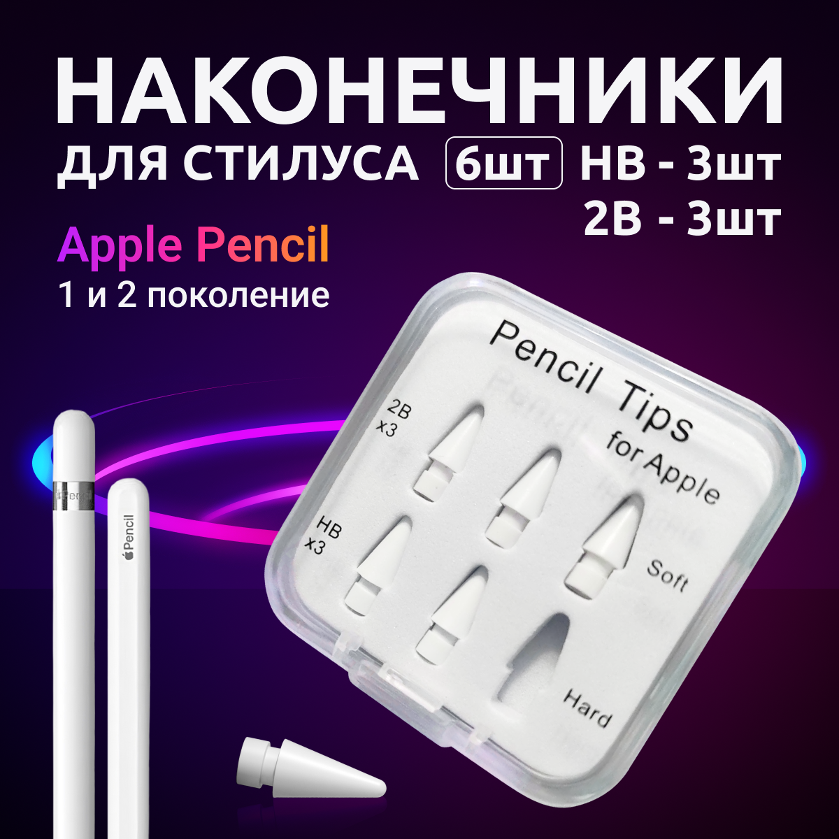 Купить Наконечники для стилуса Apple Pencil 2 и 1 поколения, 6шт в кейсе, HB и 2B, белый
