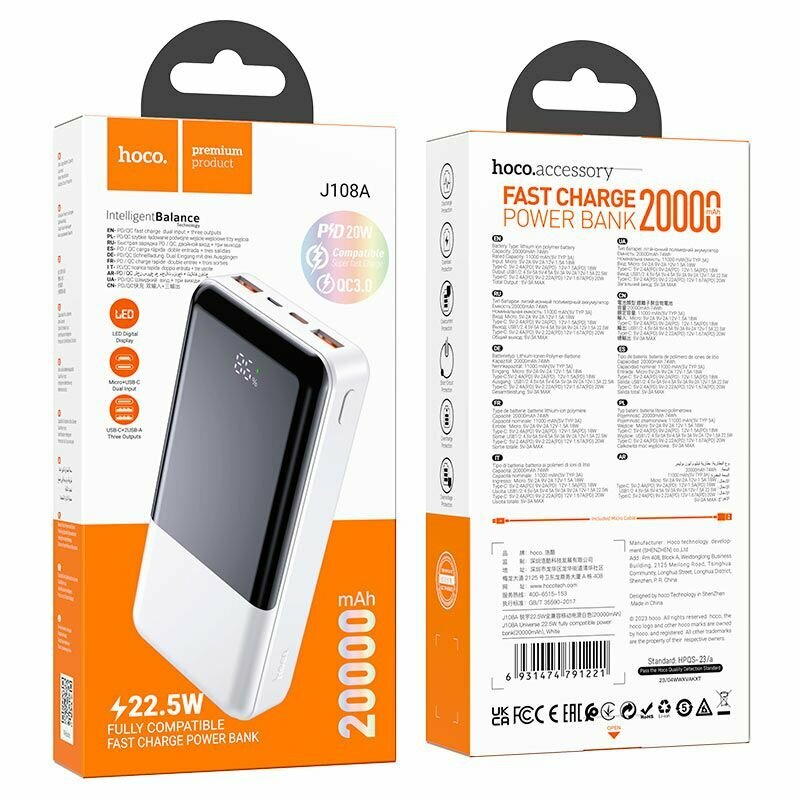 Универсальный Доп. Аккумулятор 20000mAh, J108A, HOCO, выход: 1 USB (22.5W)+1 PD (18W), белый