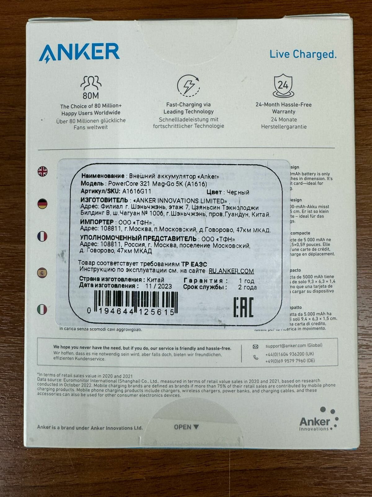 | Комплектация | Аккумулятор Anker 321 MagGo (PowerCore 5000) / инструкция. |