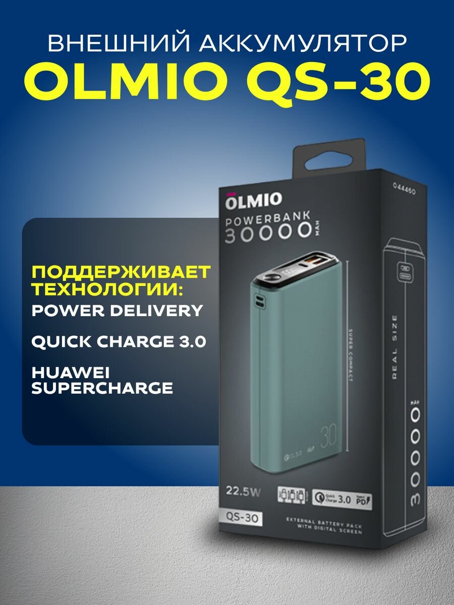 Внешний аккумулятор Olmio QS-30, 30000mAh, 22.5W, QuickCharge3.0/PowerDelivery, LCD, темно-синий