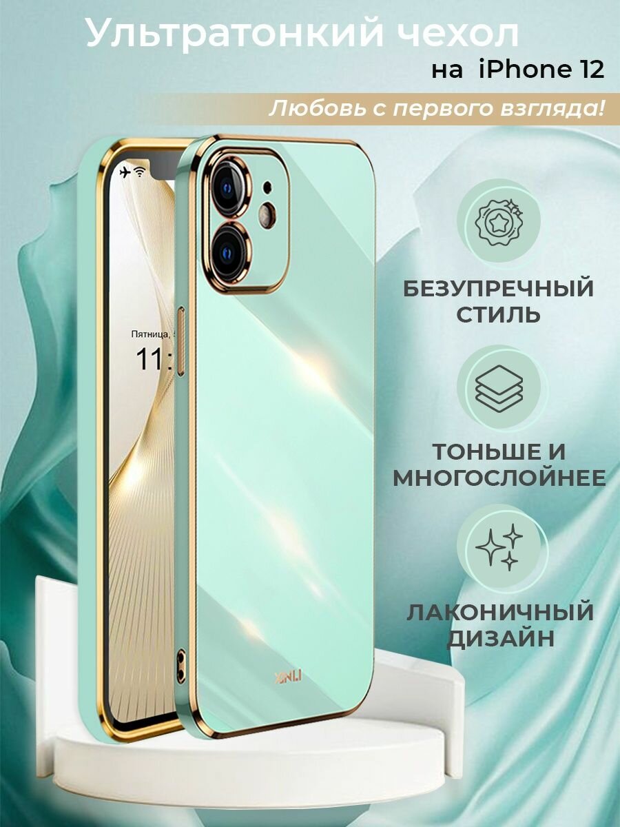Чехол на iPhone 12 защитный силиконовый бампер на айфон 12 с золотой рамкой Мятный интересное: