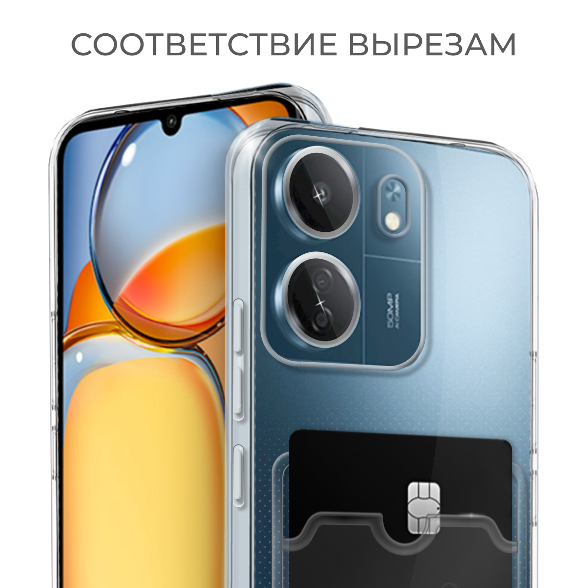 Прозрачный чехол для Xiaomi Redmi 13C 4G / с карманом для карт и противоударными углами на Ксиоми Редми 13Ц 4 джи