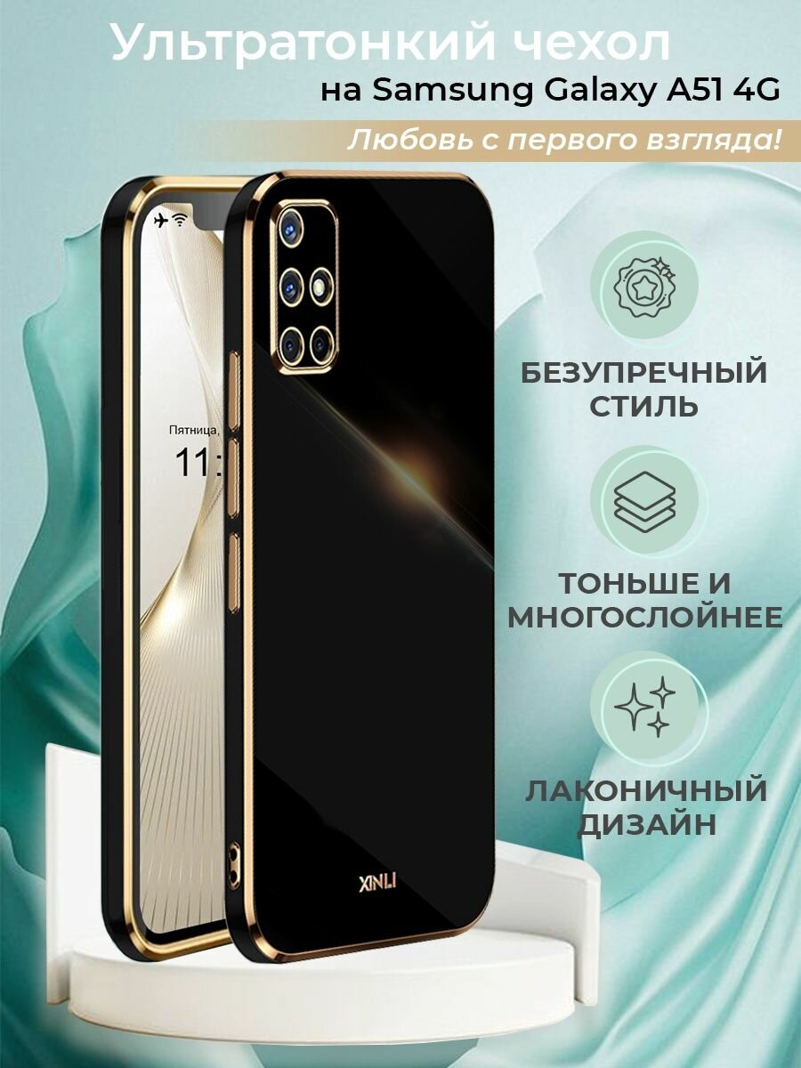 Чехол на Samsung A51 защитный силиконовый бампер на самсунг а51 с золотой рамкой Черный интересное: