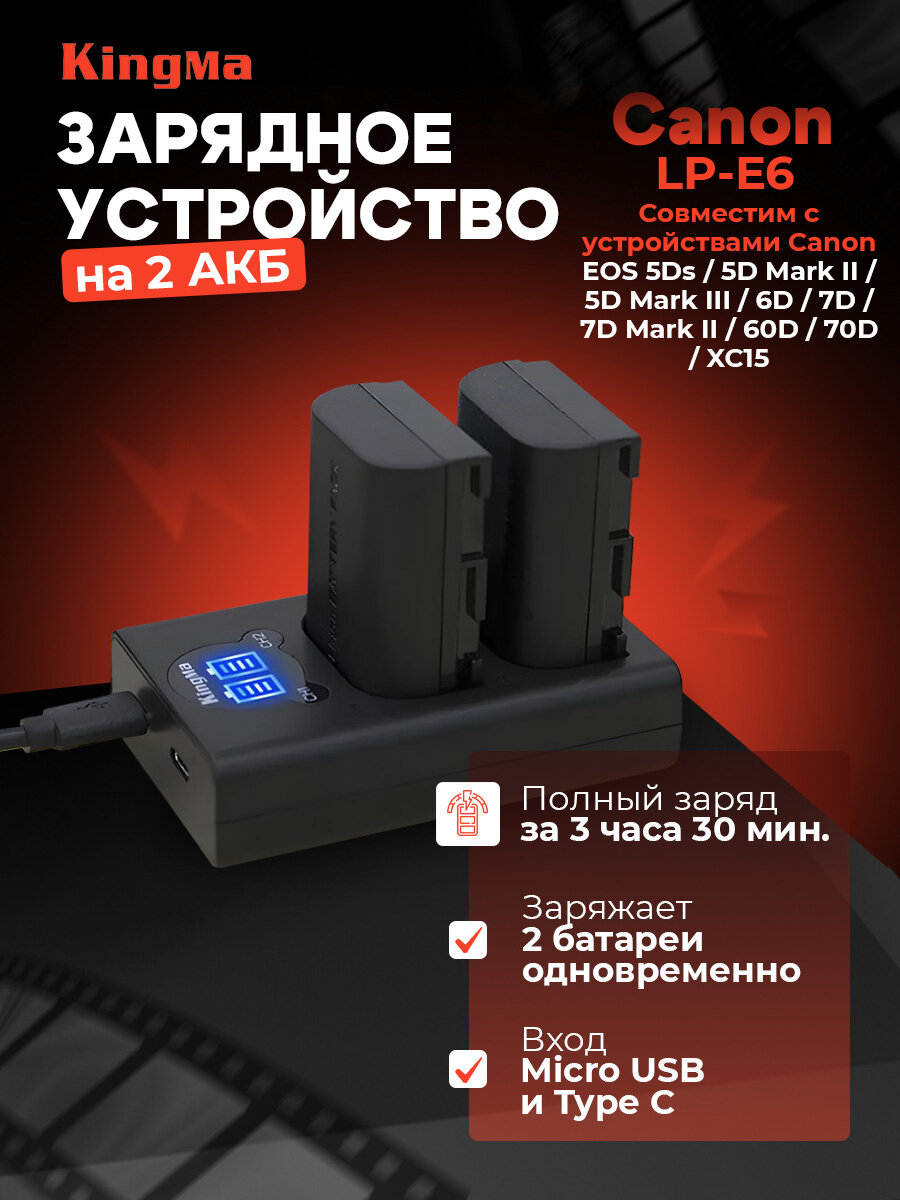 Двойное зарядное устройство KingMa BM048-LPE6 для аккумуляторов Canon LP-E6/LP-E6N