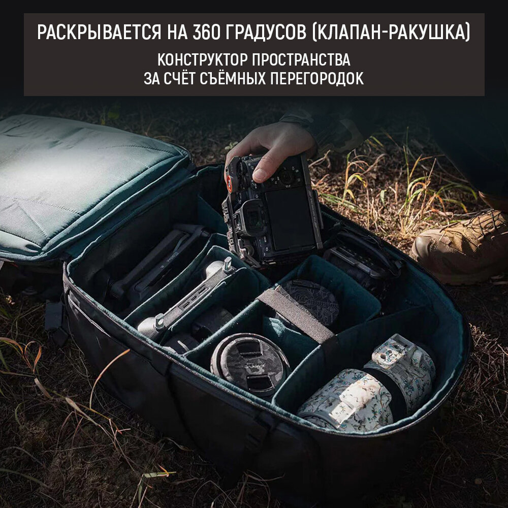 | Особенности | быстрый доступ, вентилируемая спинка, возможность организации внутреннего отсека, дождевик в комплекте, защита от воды, крепление для штатива, место для дополнительного объектива, отсек для личных вещей, плечевой ремень, ручка для переноски |
