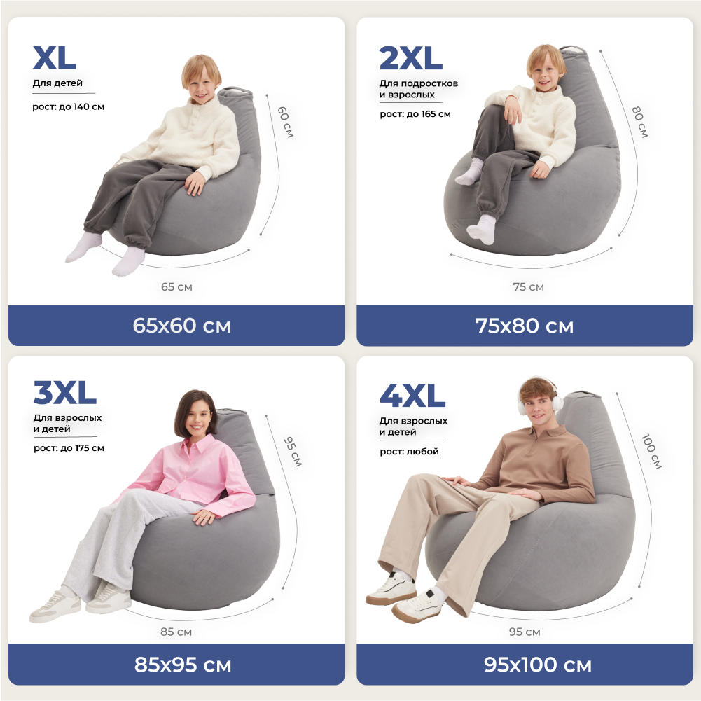 Кресло-мешок груша Bean Joy, размер ХXL, мебельный велюр, сталь