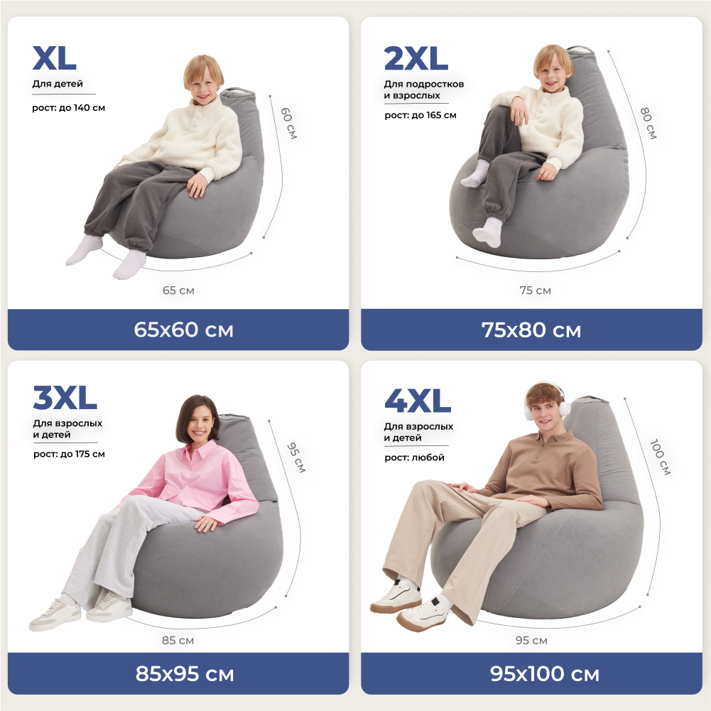 Кресло-мешок груша Bean Joy, размер ХXL, мебельный велюр, сталь