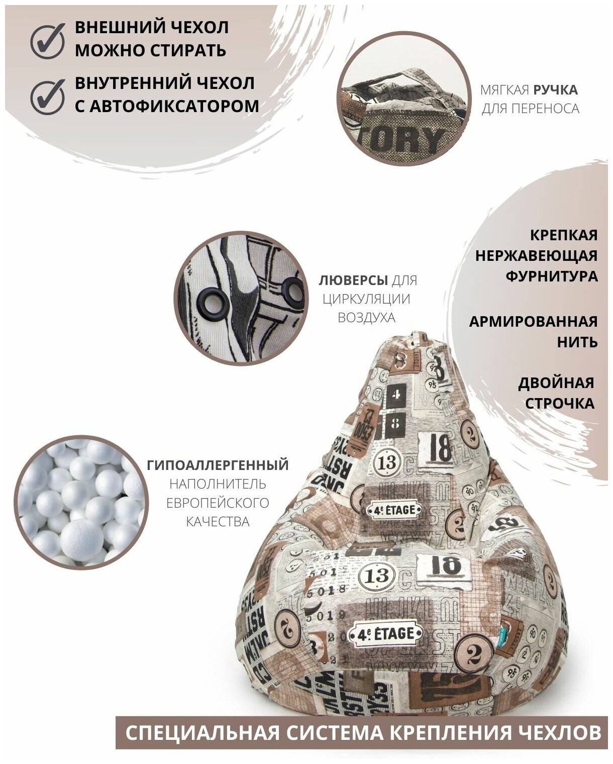 | Дополнительная информация | в комплект кресла мешка входит наполнитель пенополистирол 3-4 мм диаметром, непромокаемый внутренний чехол из нейлона на молнии, внешний чехол из микровелюра на молнии по всей длине |