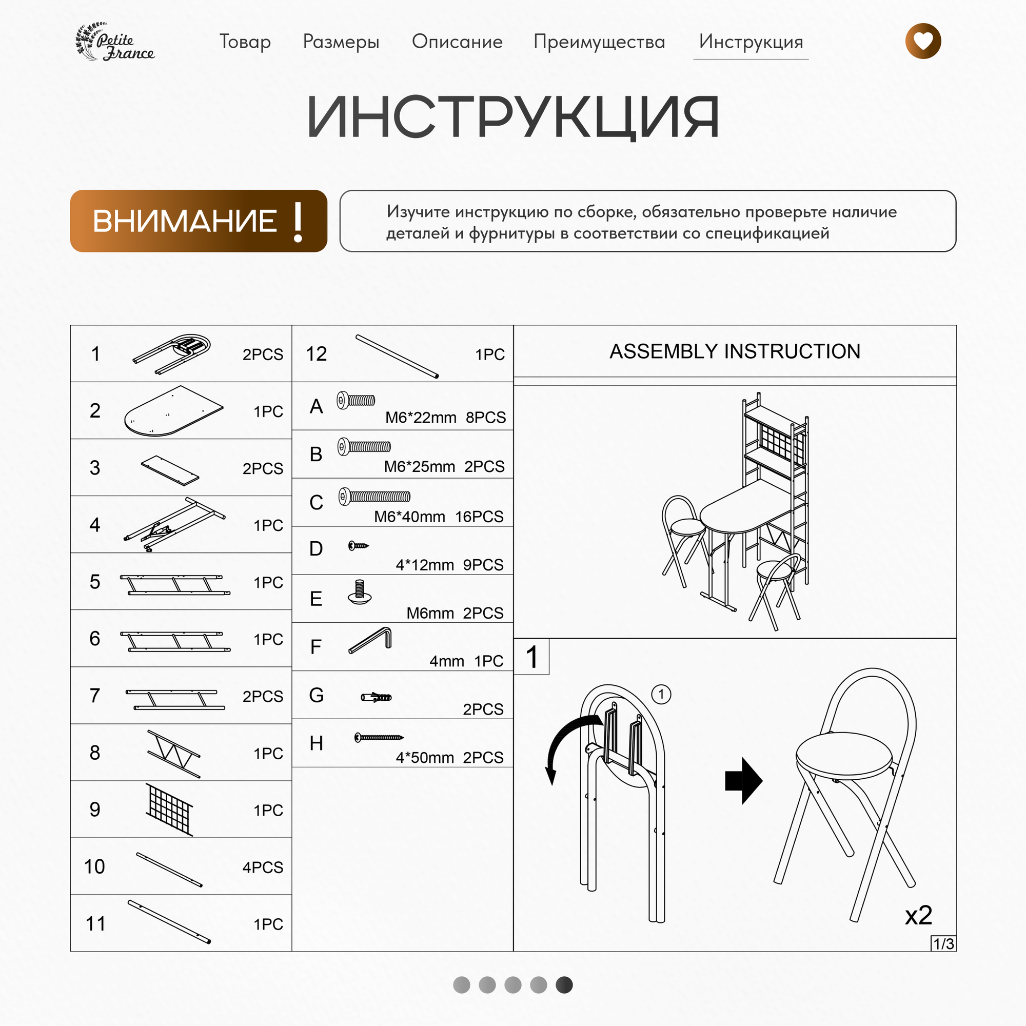 | Комплектация | Стол складной с вертикальными полками для хранения, 2 стула |