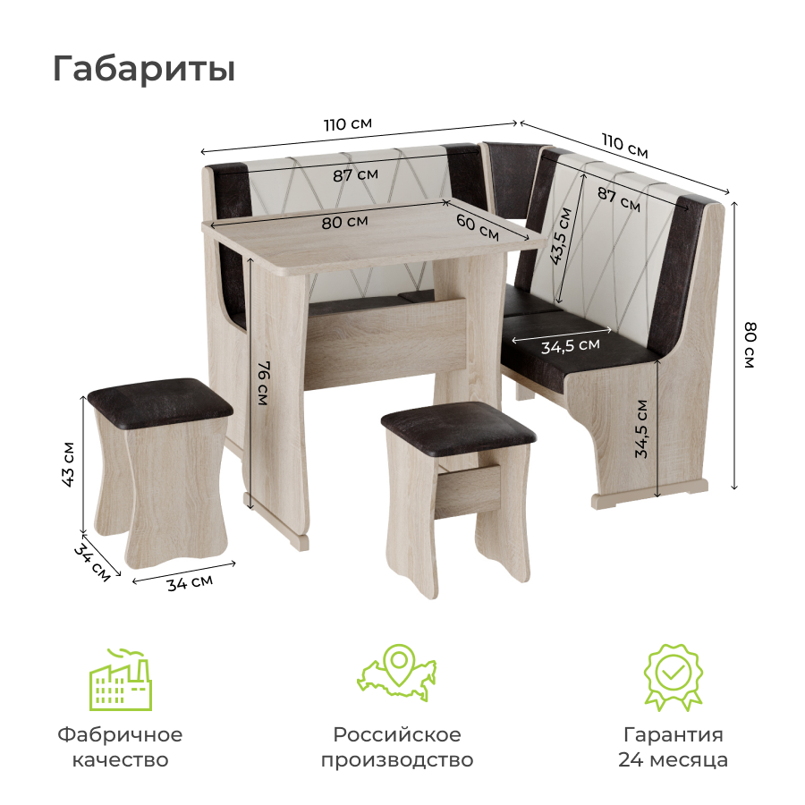 | Комплектация | Скамья угловая - 1шт., стол - 1шт., табурет - 2шт., фурнитура, паспорт изделия |