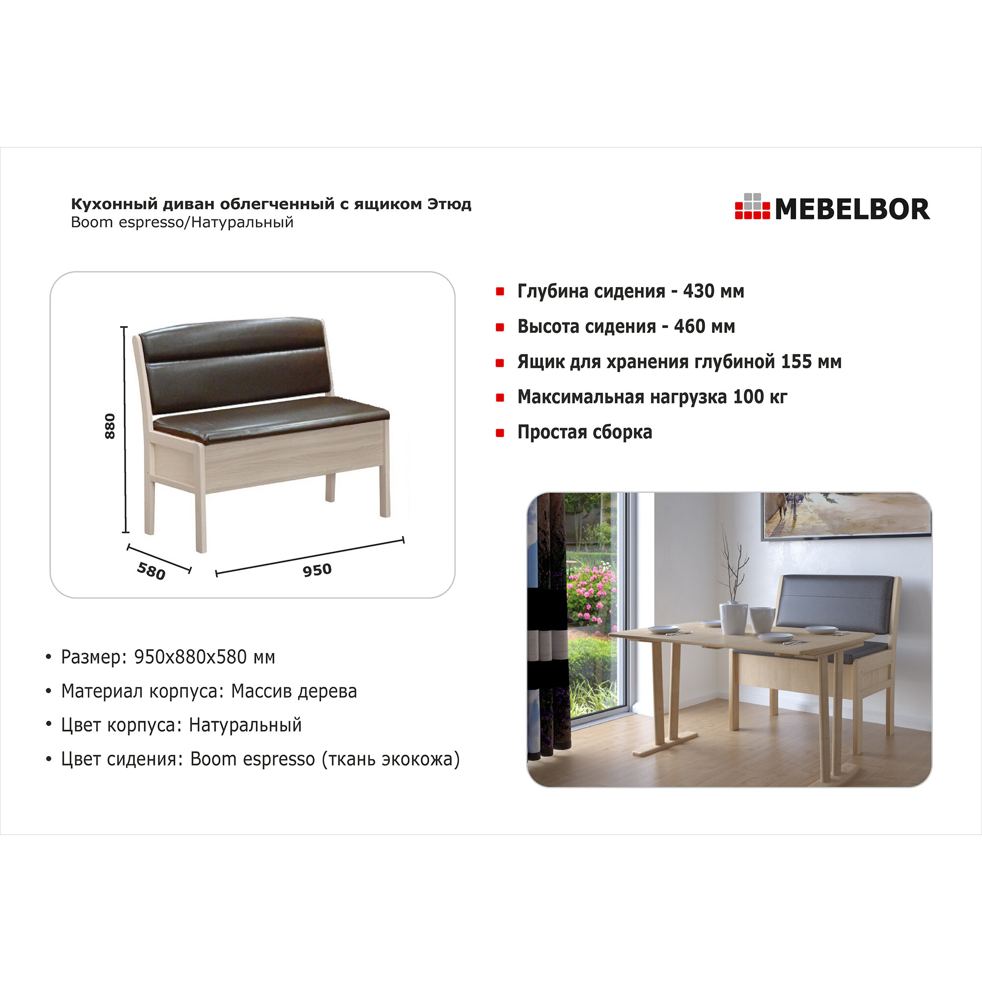 Ниже Вы можете прочитать отзывы на Кухонный диван Боровичи-мебель Этюд облегченный 940 с ящиком Boom espresso/Натуральный 14633, ознакомится с подробными характеристиками, посмотреть интересные обзоры и фотографии на Кухонный диван Боровичи-мебель Этюд облегченный 940 с ящиком Boom espresso/Натуральный 14633.