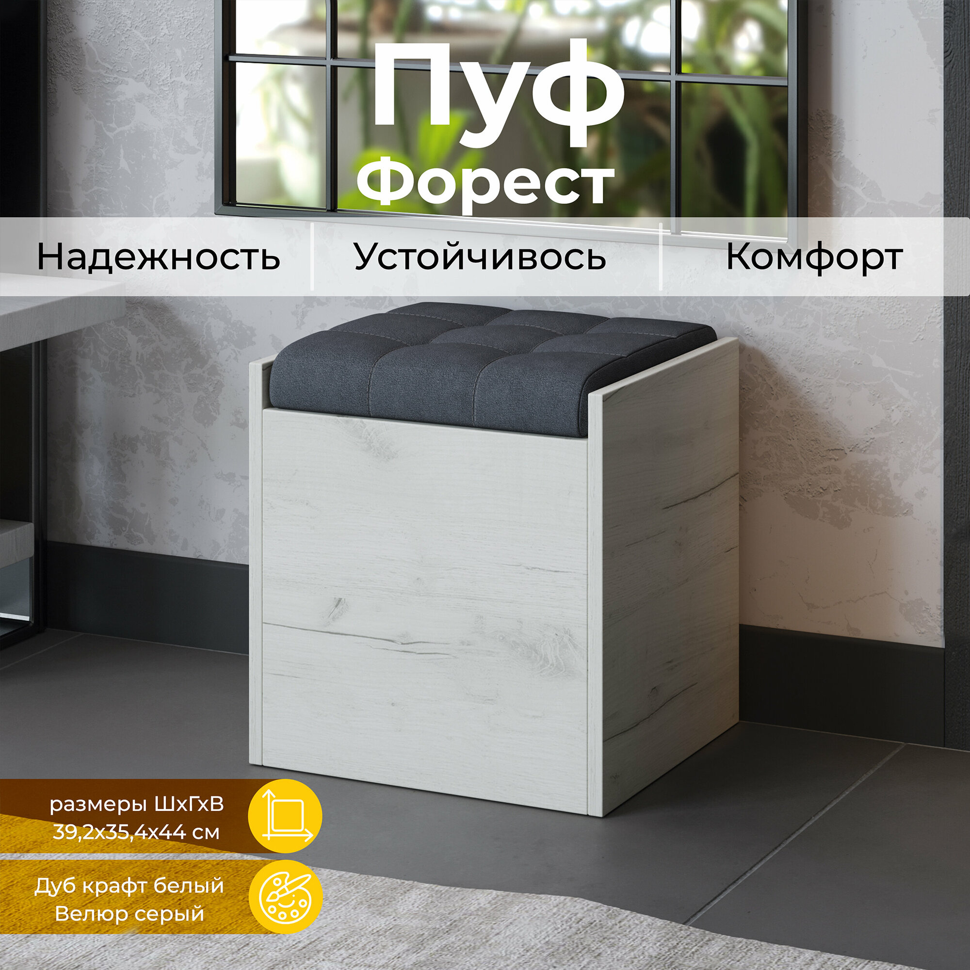 Пуф банкетка с ящиком серый (ВхШхГ) 44х39х35 см, Форест интересное: