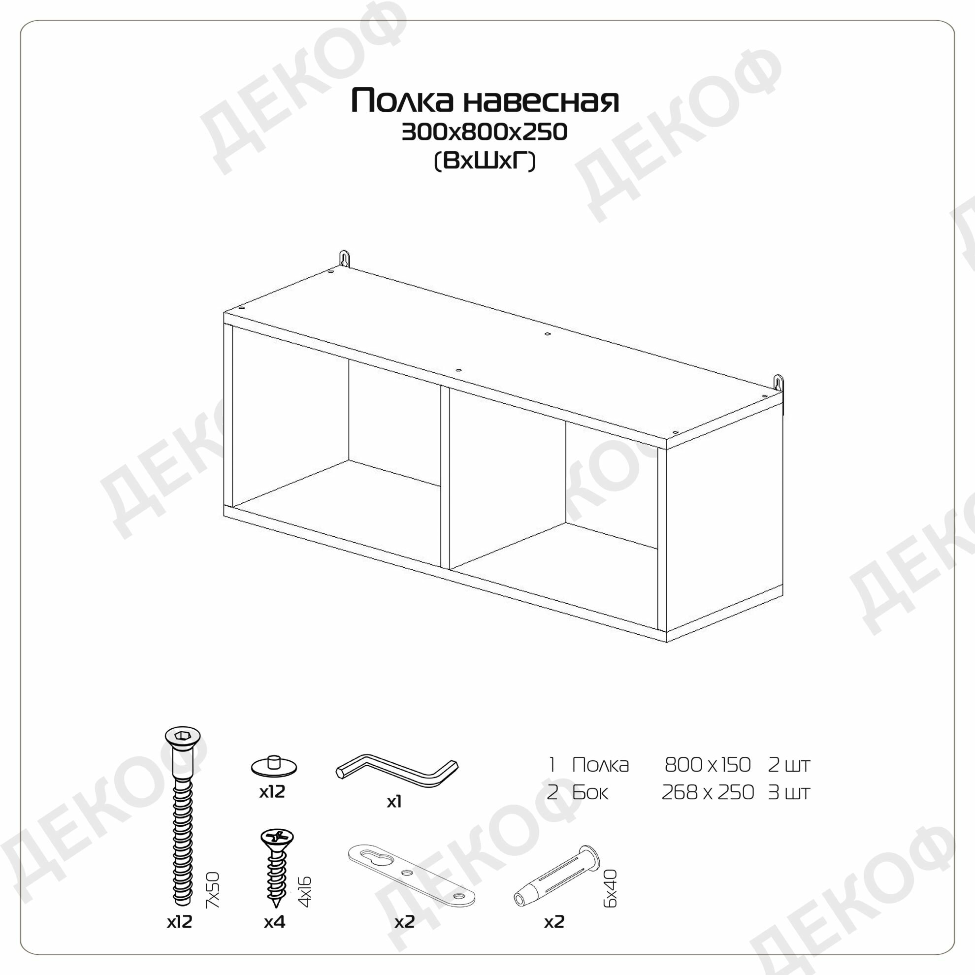 | Комплектация | Панель ЛДСП 800*250 2 шт. Панель ЛДСП 268*250 3 шт. Шестигранник - 1 шт Навесы - 2 шт Евровинты - 12 шт Заглушки - 12 шт Саморезы (16 мм) - 4 шт Дюбель - саморез - 2 шт |