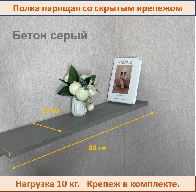 СохранитьПолка парящая настенная из ЛДСП со скрытым креплением, цвет серый бетон, размер 80х20х1,8 см. интересное: