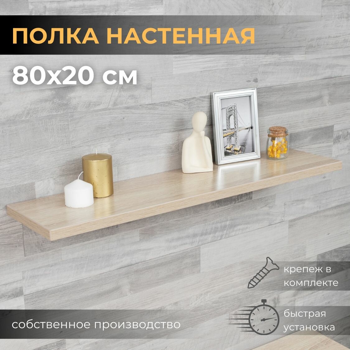 Полка настенная прямая навесная, со скрытым монтажом, дуб крафт, 80х20
