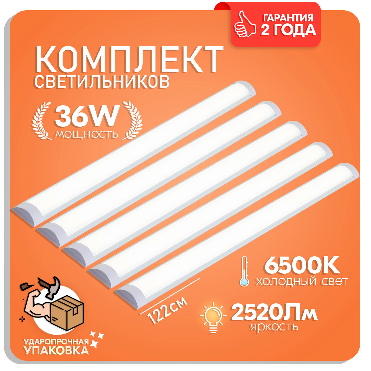 Линейный светодиодный светильник 36W, 6500К холодный свет, прямое подключение к сети, набор 5 шт интересное: