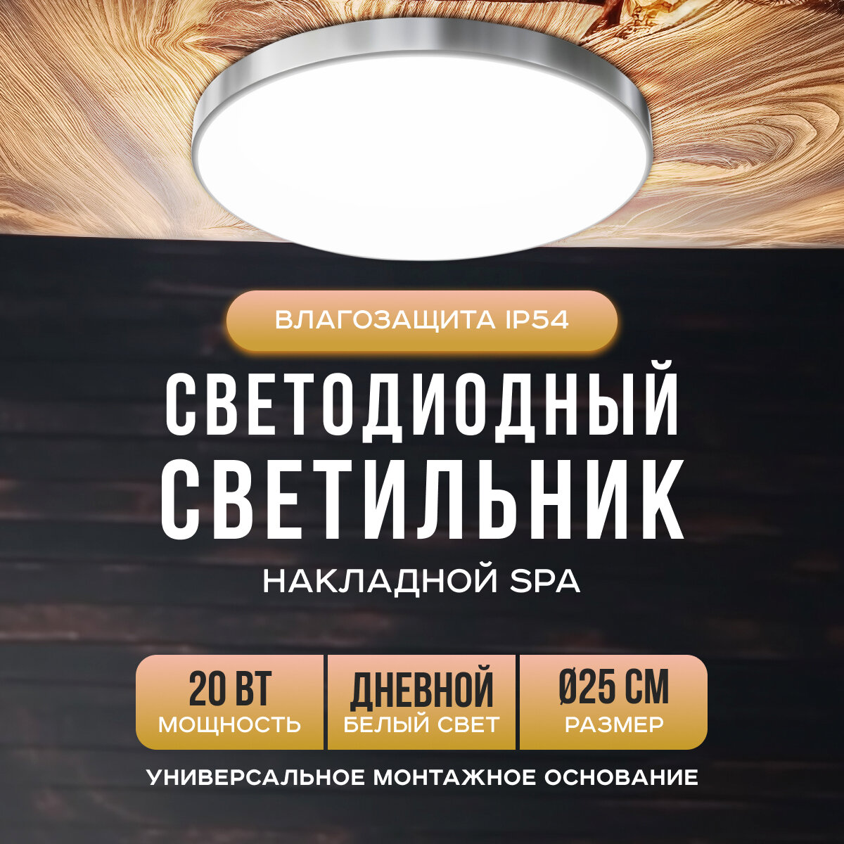 Светильник светодиодный накладной SPA, 20Вт, 230В/50Гц, 1600лм, 4000К, IP54, ø250х30мм, 18-143, круг, серебро, полипропилен, с платформой для монтажа интересное: