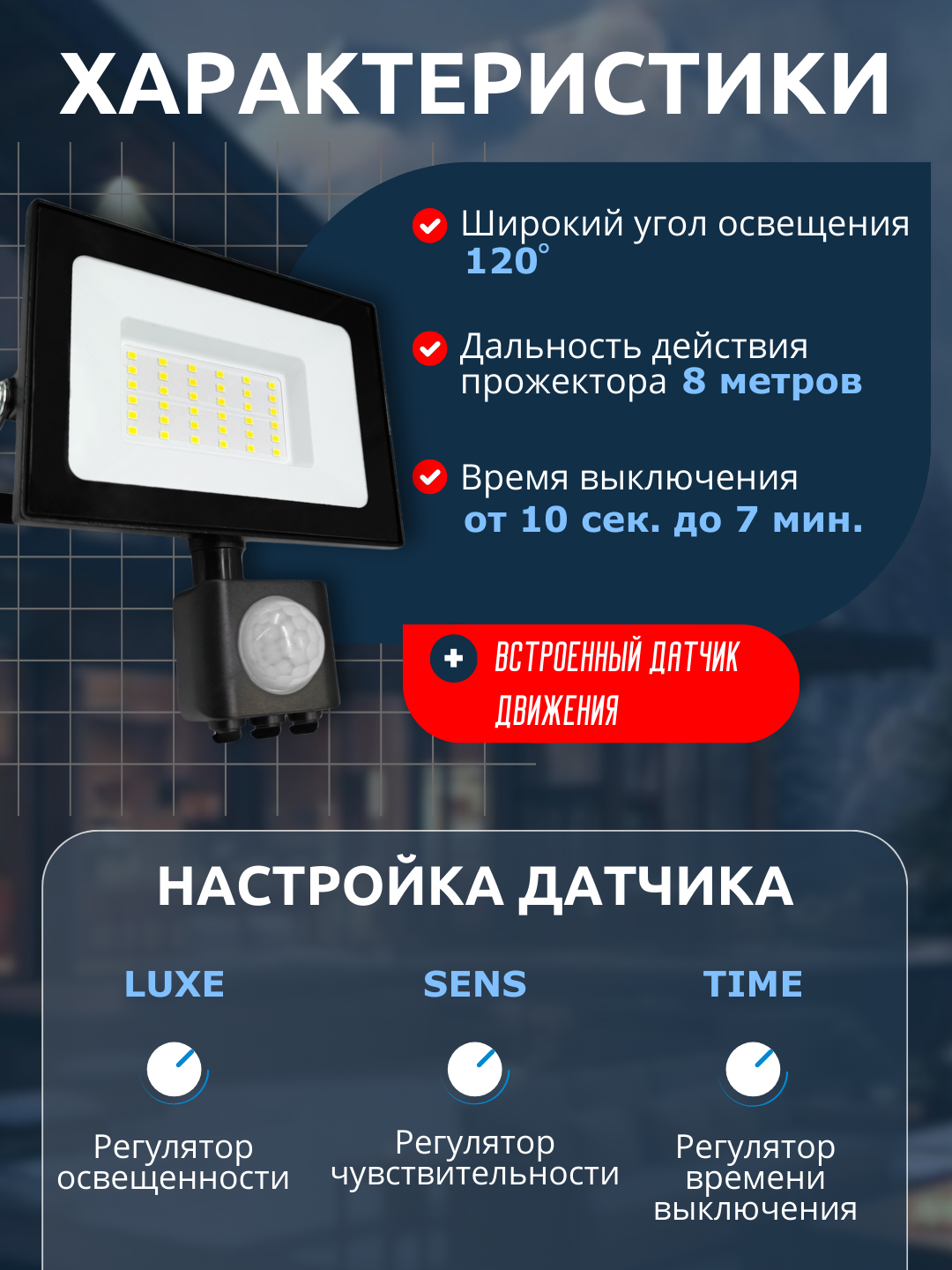 "Прожектор с датчиком движения" - 20Вт, 6500K, угол обзора - 120 градусов, IP65, черный
