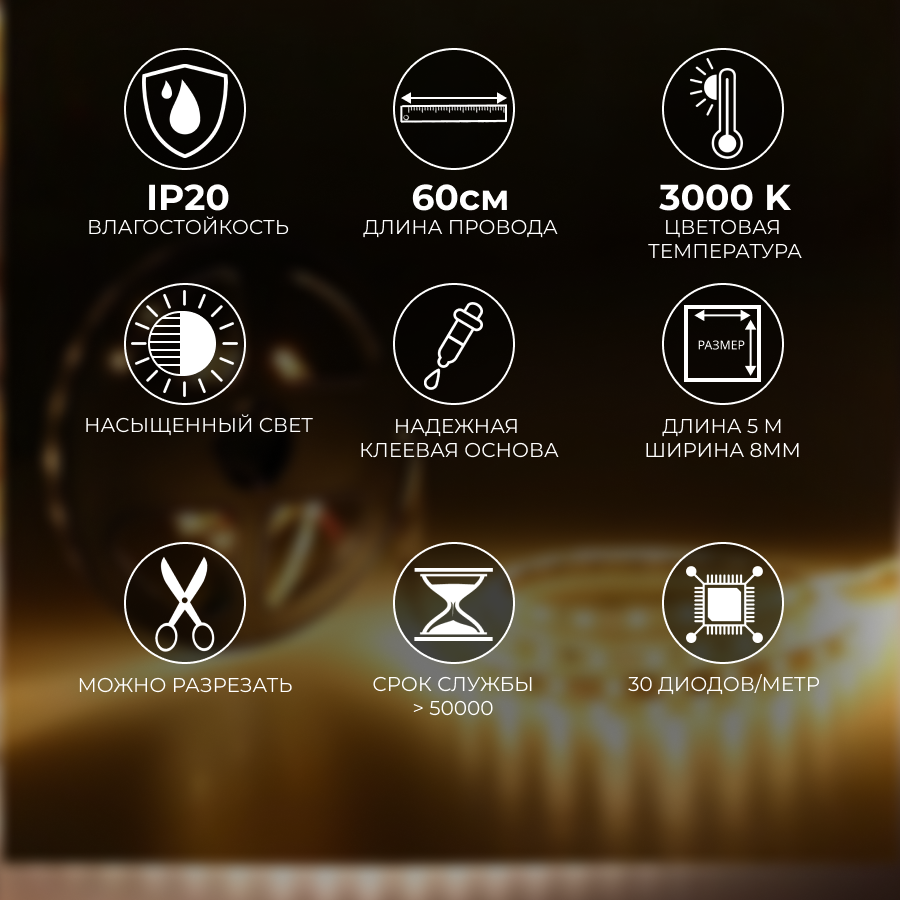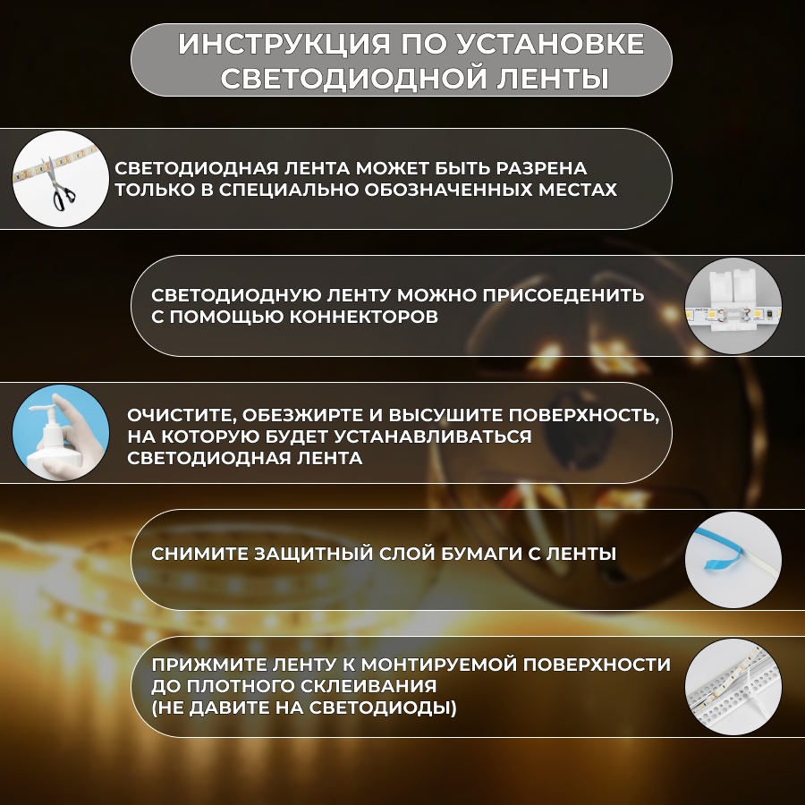 | Особенности | возможность подключения диммера / режим ночника / самоклеящаяся основа |