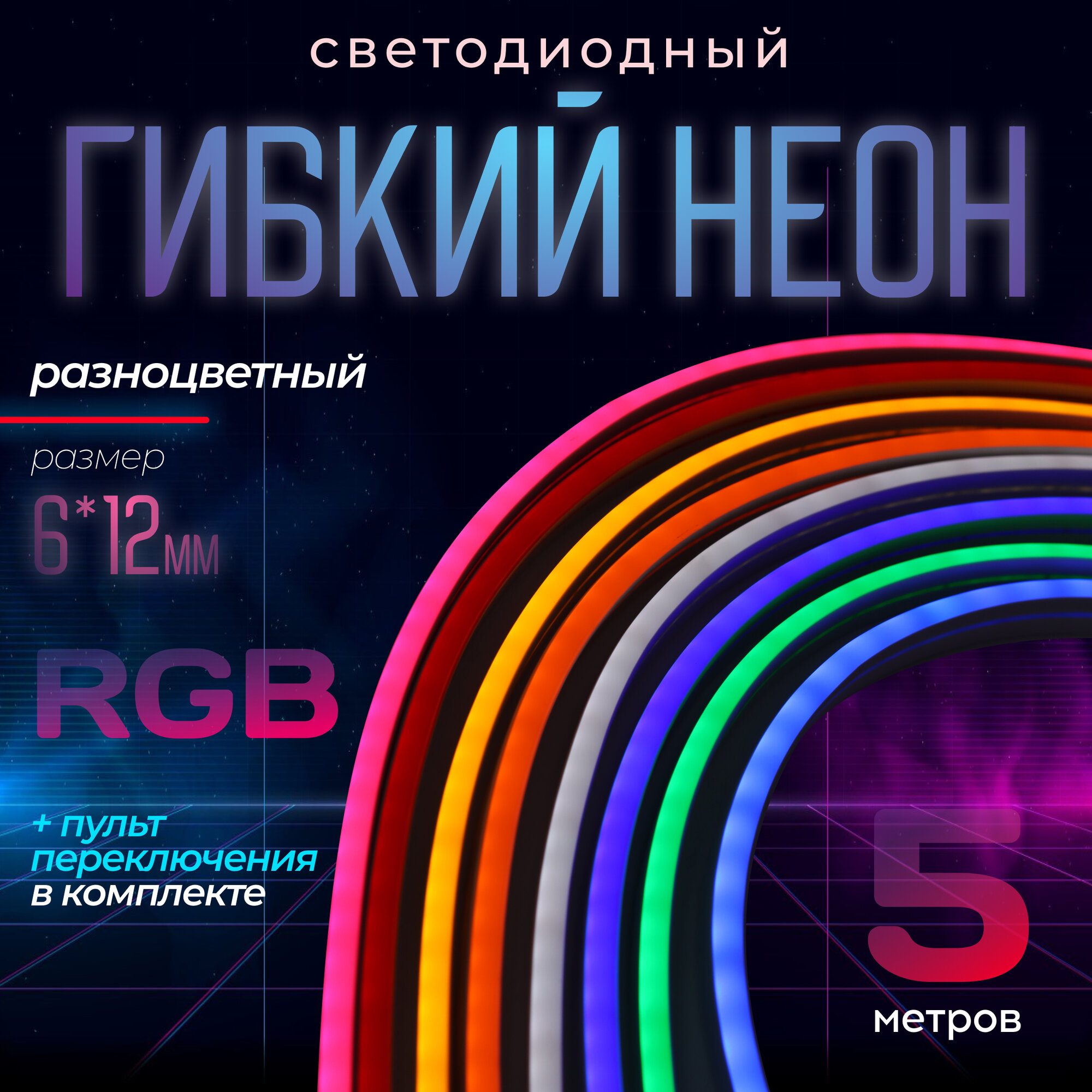 Купить Светодиодный гибкий неон RGB 5 метров 12В, размер 6х12мм, цвет разноцветный. Пульт переключения в комплекте