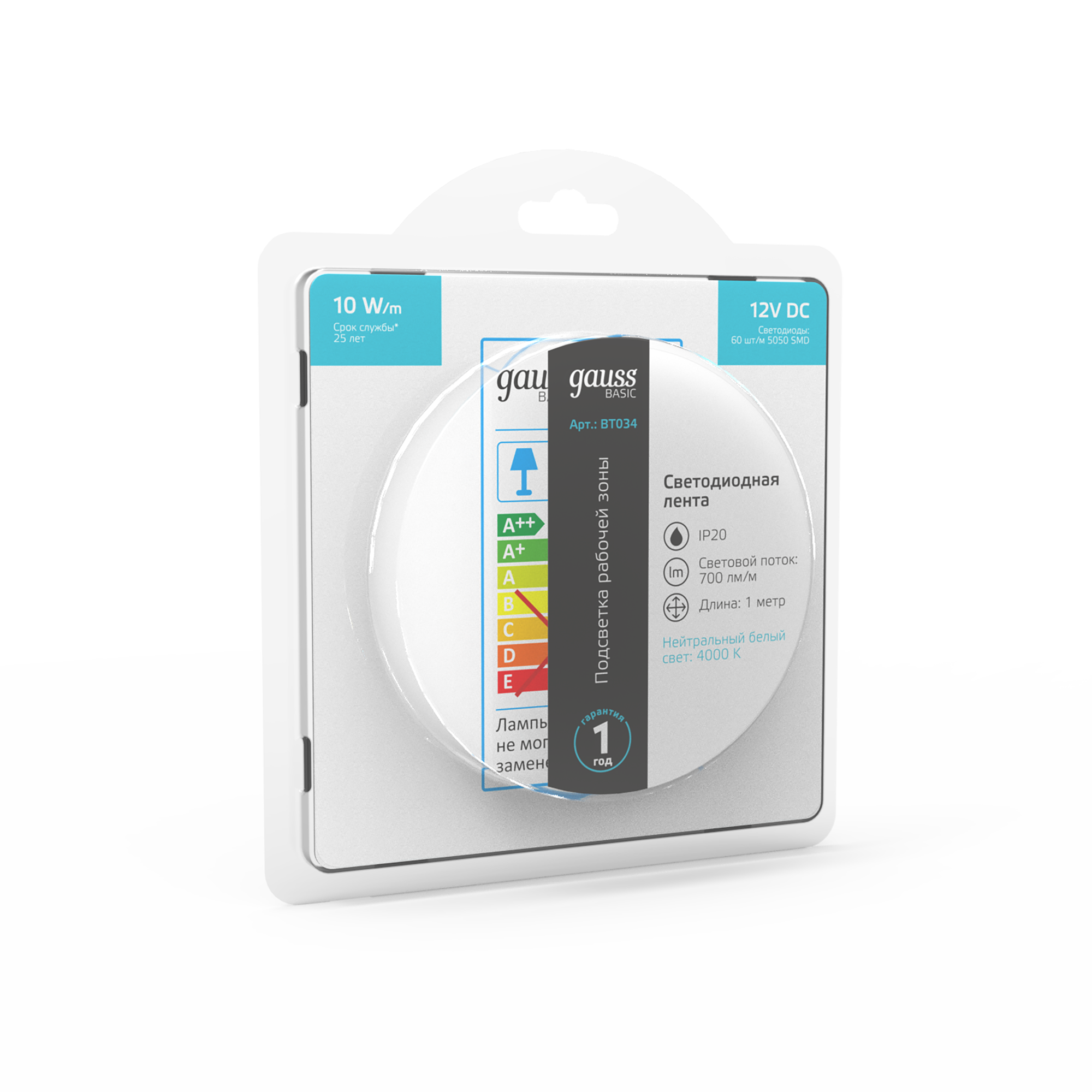 Лента светодиодная 5050/60 12V 10W/m 700lm/m 4000K 10mm IP20 1m Gauss Basic интересное: