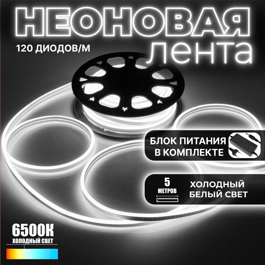Купить Неоновая светодиодная лента, холодный белый свет, 5 метров, с блоком питания, гибкий неон