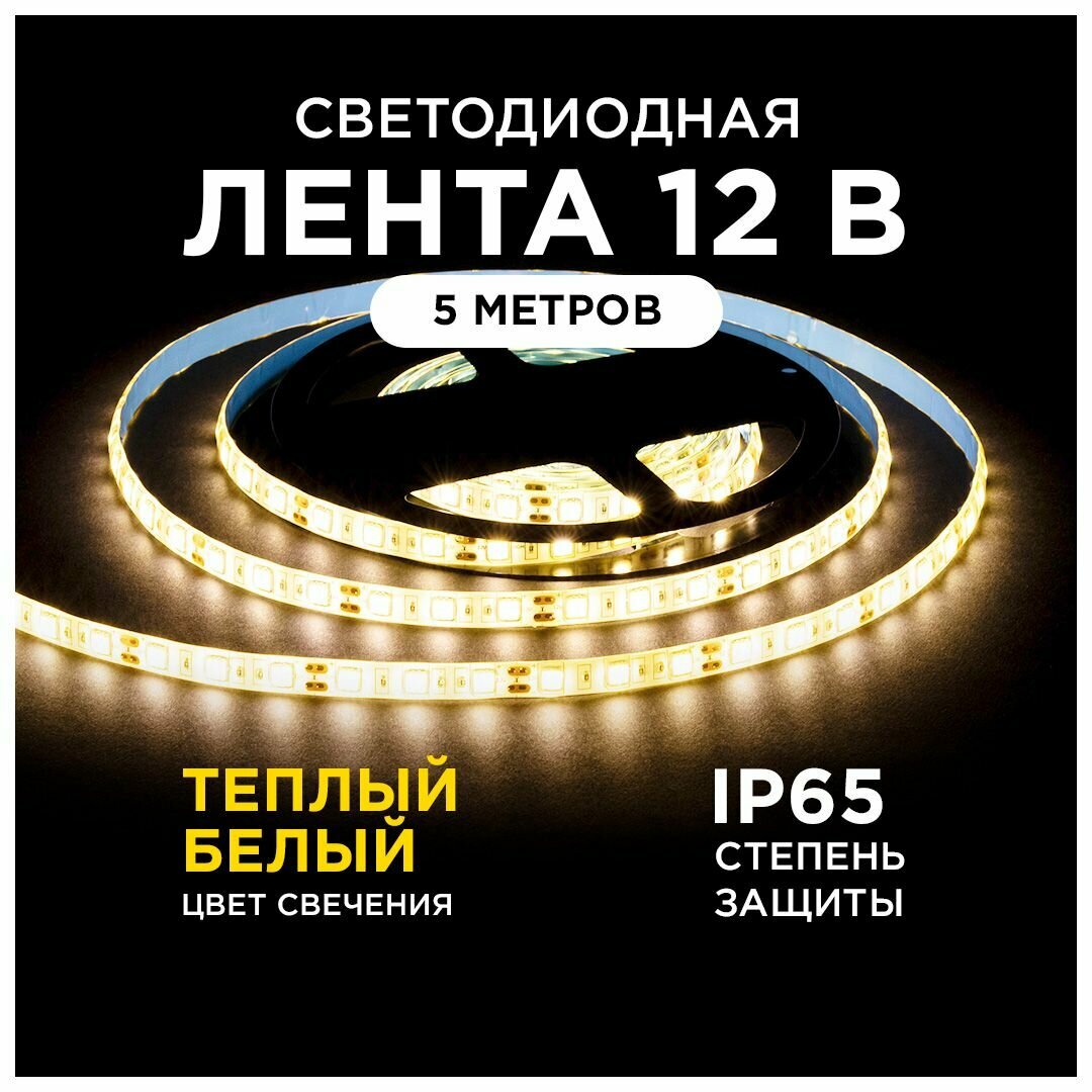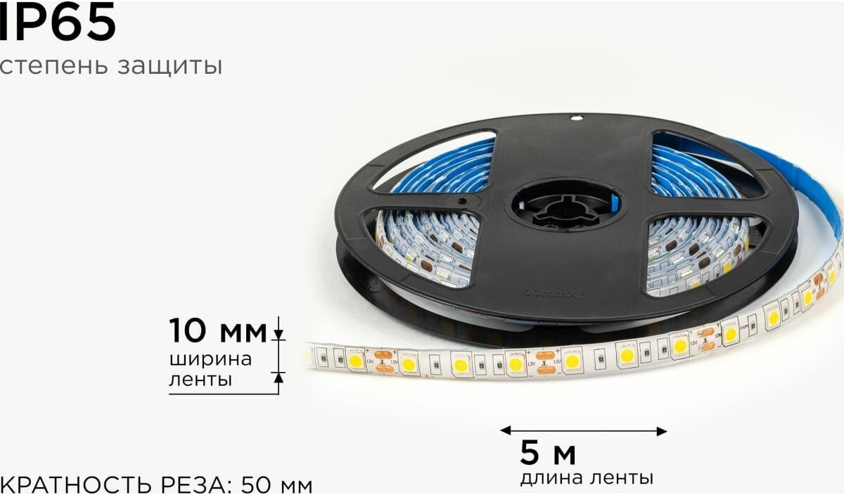 Светодиодная лента 12В, 14,4Вт/м, smd5050, 60д/м, IP65, 12Лм/чип, ширина подложки 10мм, 5м, т/б, 3000К