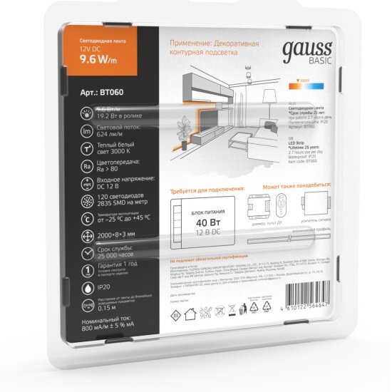 | Комплектация | Лента LED (3000К) Basic GAUSS тип 2835 DC 12В 9,6Вт 624лм/Вт 120led/м IP20 8 мм (бухта 3м) |