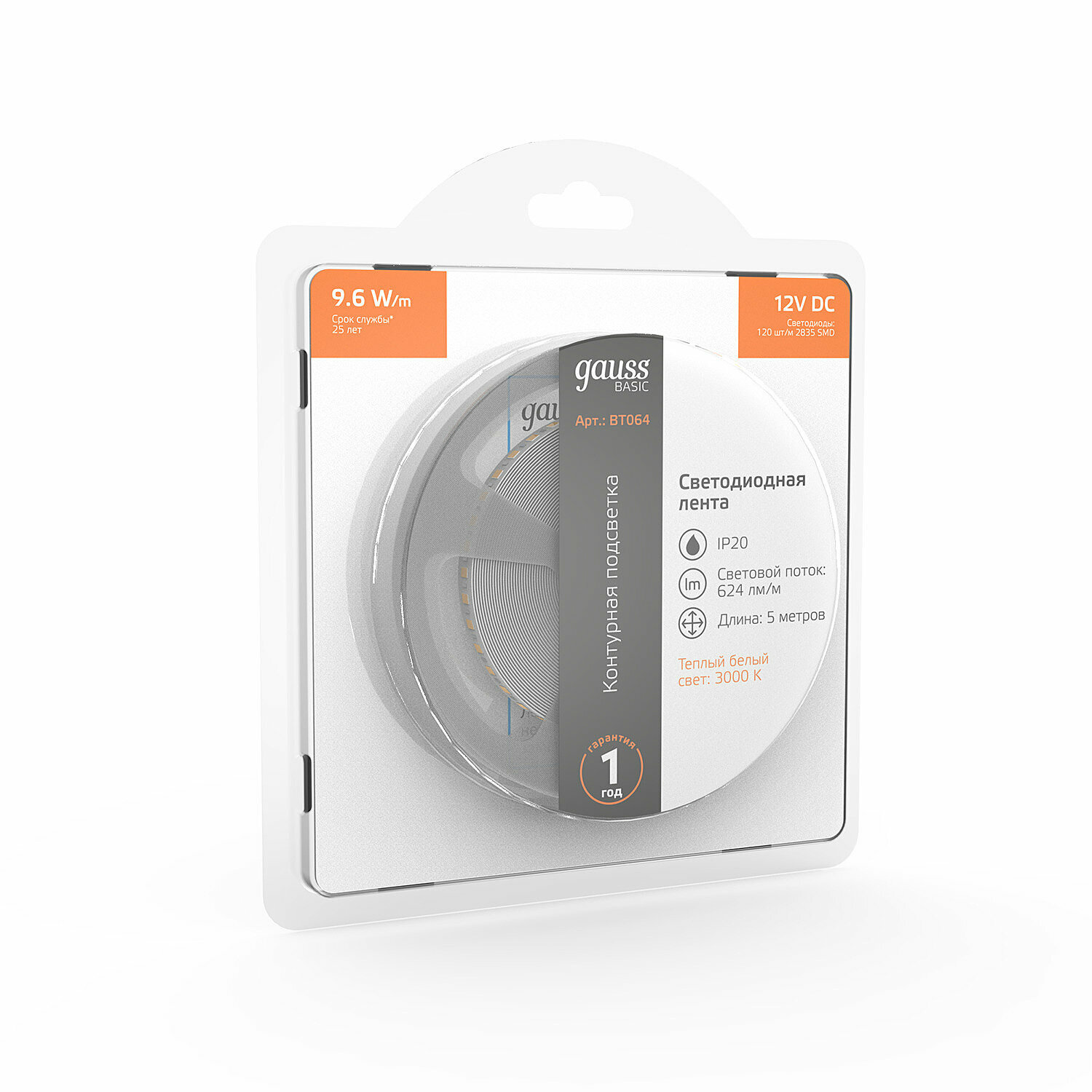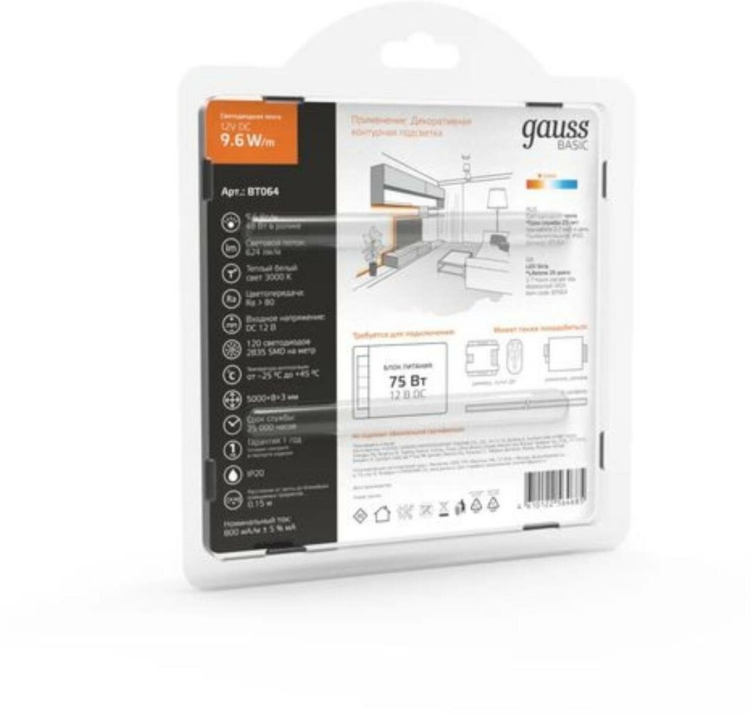| Комплектация | Лента LED (3000К) Basic GAUSS тип 2835 DC 12В 9,6Вт 624лм/Вт 120led/м IP20 8 мм (бухта 3м) |