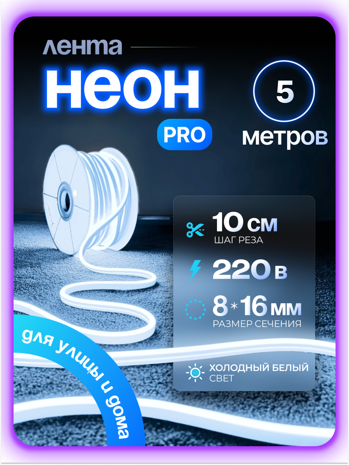 Неоновая светодиодная лента PJ Neon, 5 метров, 8х16мм, 220В, IP 67, гибкий неон, фиолетовый, кратность реза 10 см