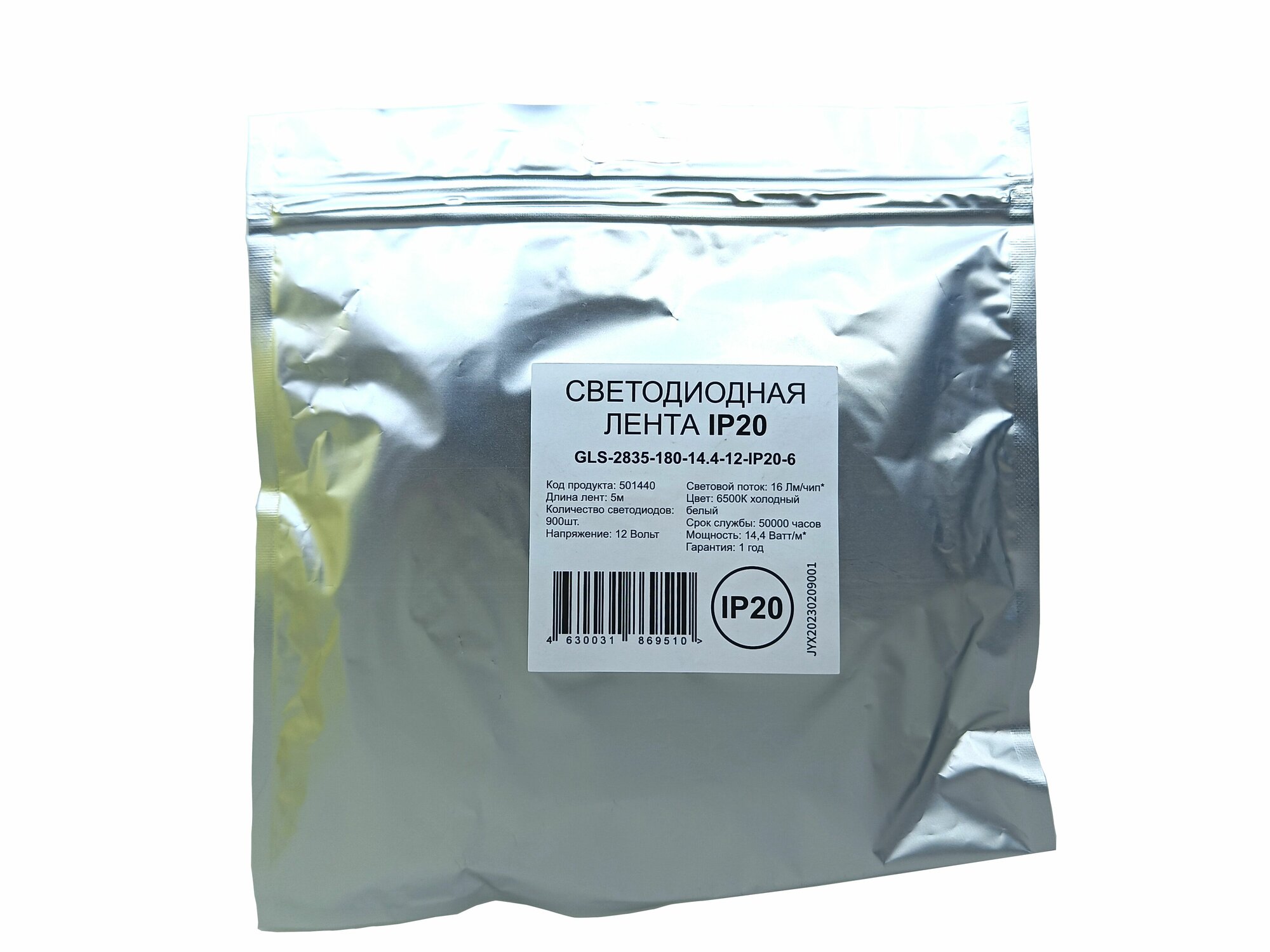 Светодиодная лента General 14.4 Вт/м, 12V, IP20, SMD2835, 180диодов/м, холодный белый 6500K (GLS-2835-180-14.4-12-IP20-6), 5м
