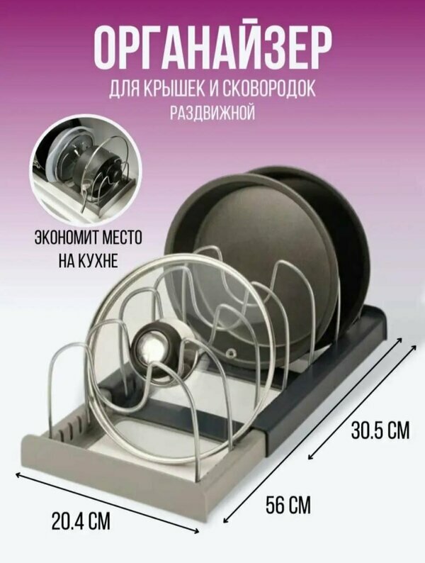 | Дополнительная информация | Держатель кухонный для крышек, сковород, тарелок, кастрюль / Кухонный органайзер / Подставка для посуды раздвижная |