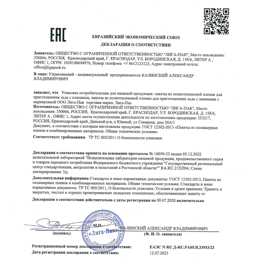 | Комплектация | пакеты для льда |