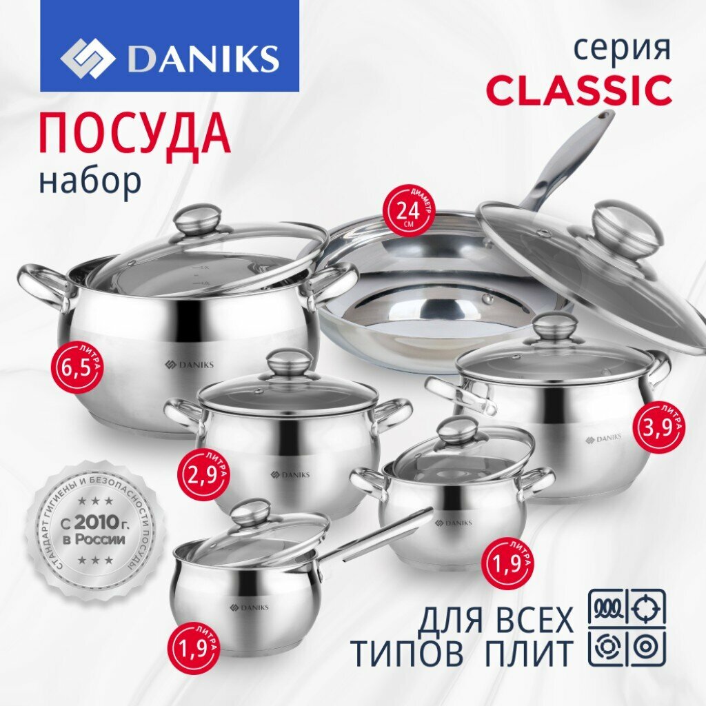 Набор посуды Daniks из нержавеющей стали, 12 предметов, кастрюли 1.9,2.9,3.9,6,5л,ковш 1.9 л, сковорода 24см интересное: