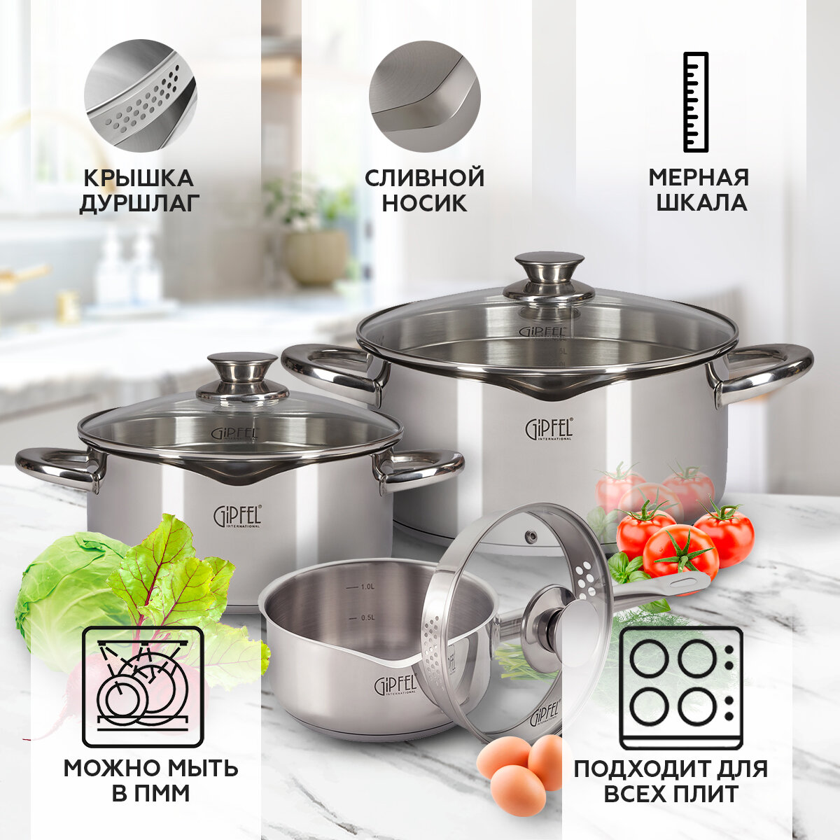 | Подробная комплектация | ковш 16х7,5/1л c крышкой; кастрюля 20х9,5/2,5л с крышкой; кастрюля 24х11,5/4,5л с крышкой |