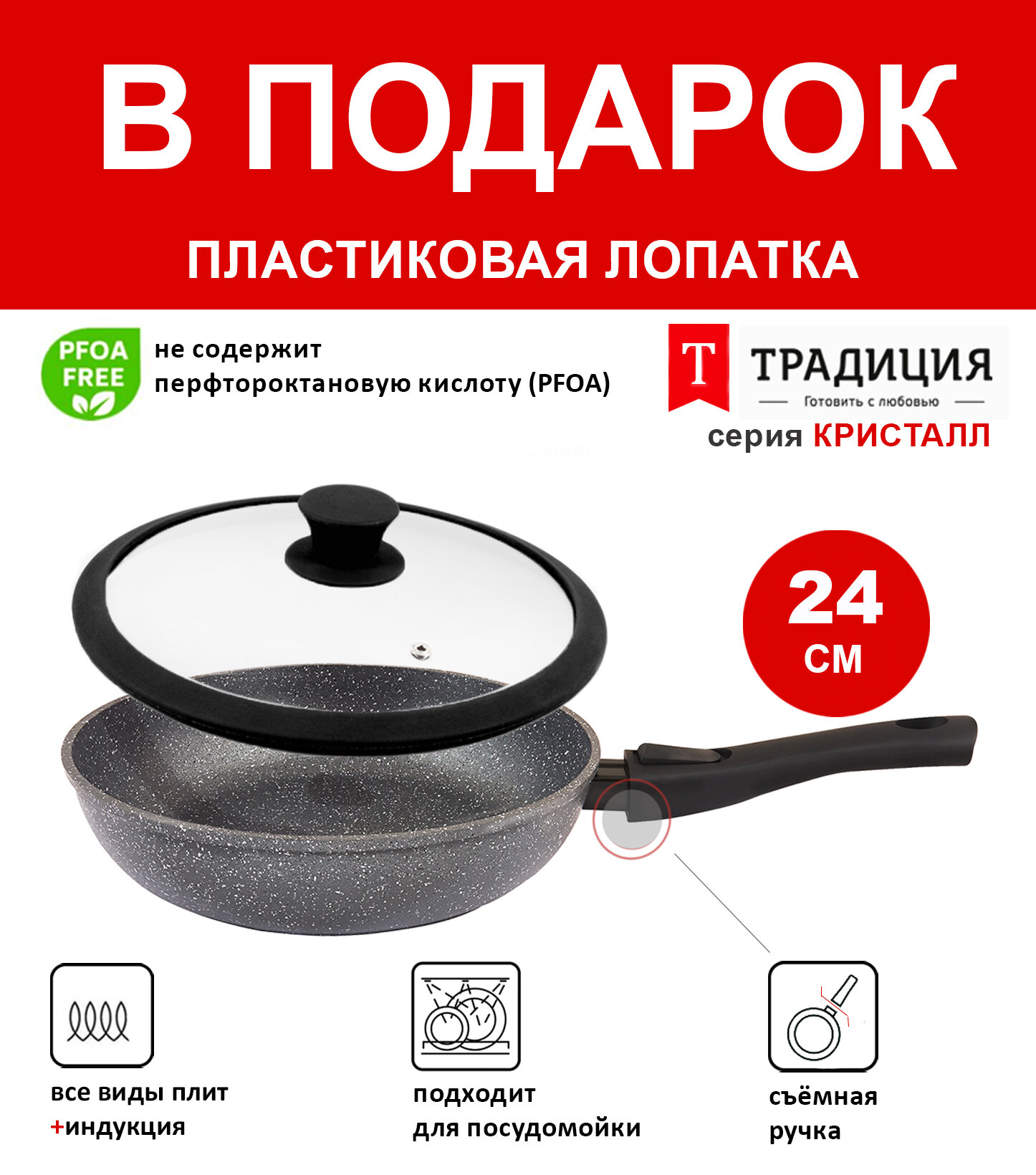 Купить Сковорода 24см с крышкой ТМ традиция Кристалл индукция съемная ручка каменное покрытие, Россия + Лопатка в подарок