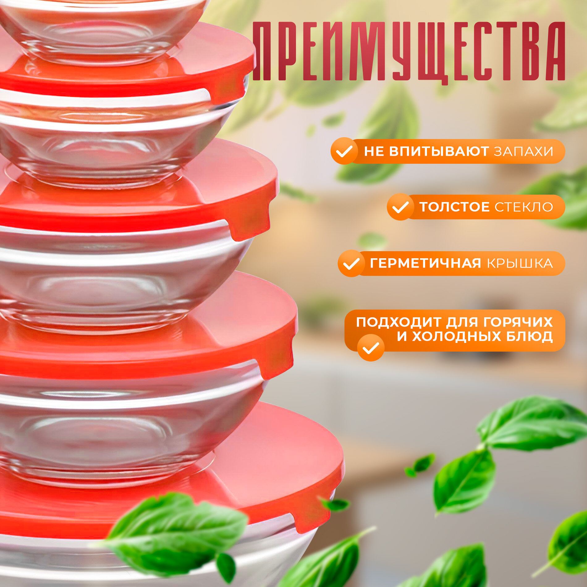 Набор стеклянных салатников с крышками Доляна «Классика» набор: 5 предметов, 900 мл, 500 мл, 350 мл, 200 мл, 130 мл