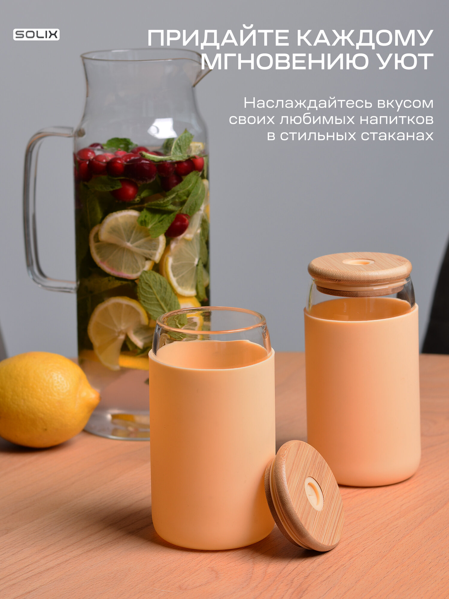 Стеклянные стаканы с бамбуковой крышкой, бежевый, 2шт