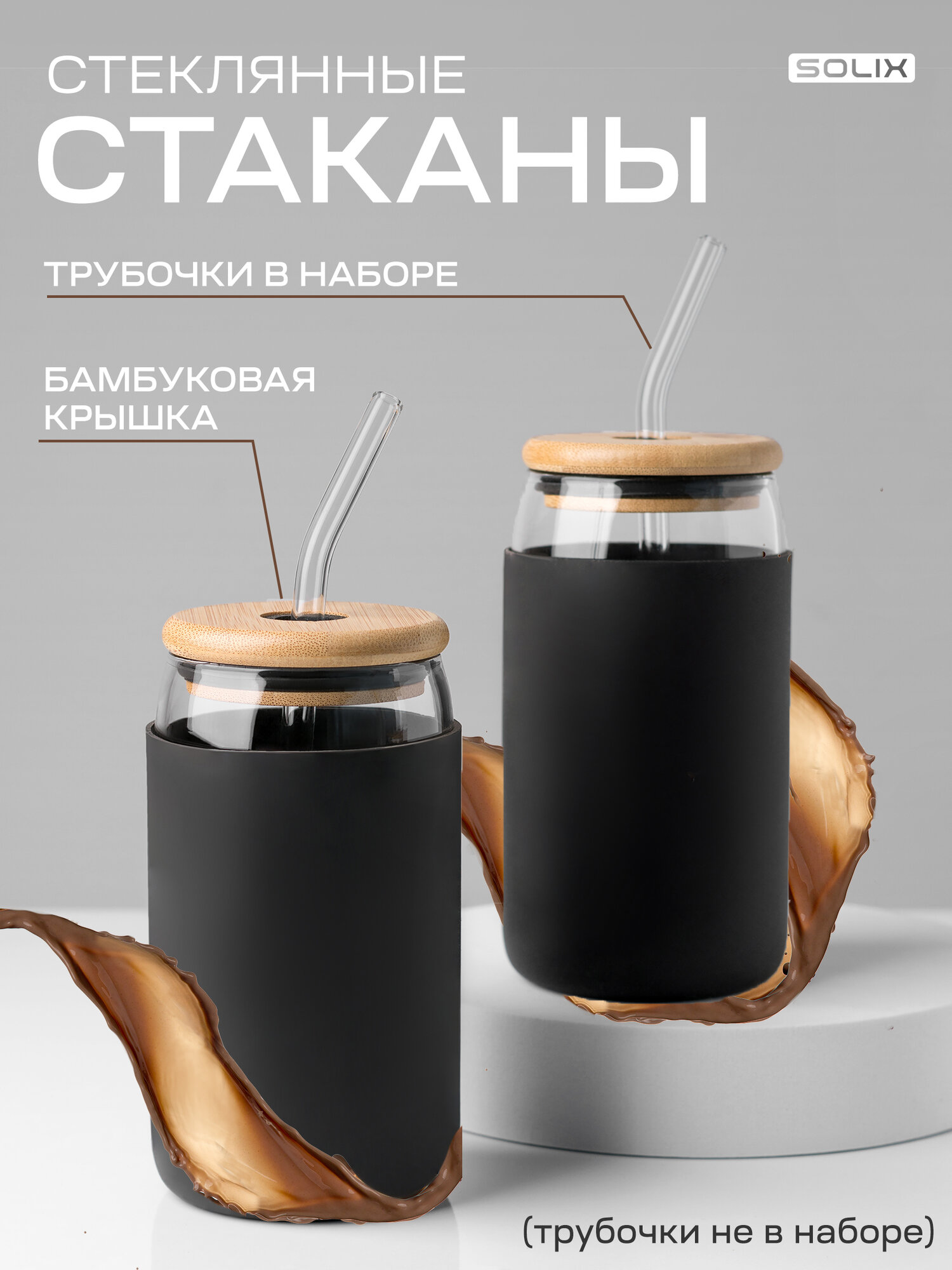 Купить Стеклянные стаканы с бамбуковой крышкой, черный, 2шт